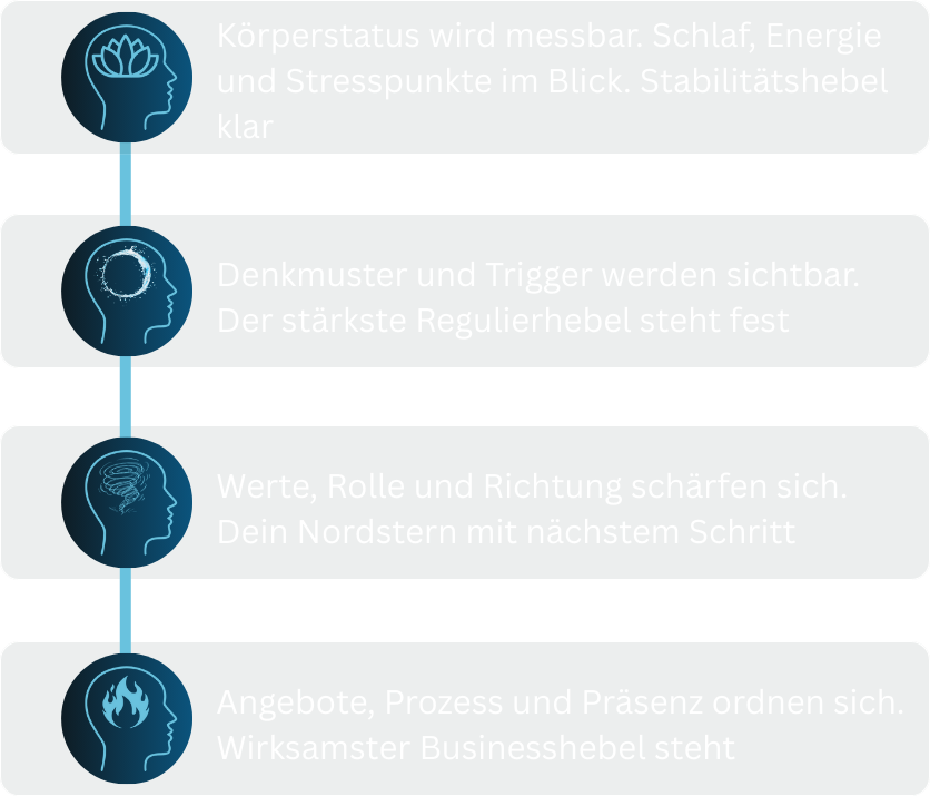 Strukturierte Standortbestimmung. Der Balance-Score zeigt, wo das Uhrwerk hakt und welcher Hebel zuerst greift. Du gewinnst Klarheit in 60–90 Minuten.